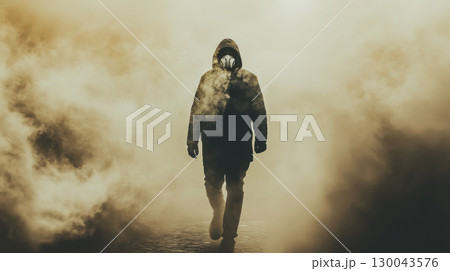 person walking through thick smoky atmosphere, wearing hooded jacket and mask, creates mysterious and eerie scene. fog envelops surroundings, enhancing dramatic effect