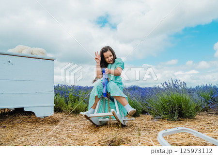 A cute girl on a wooden toy rocking horse in a lavender field.