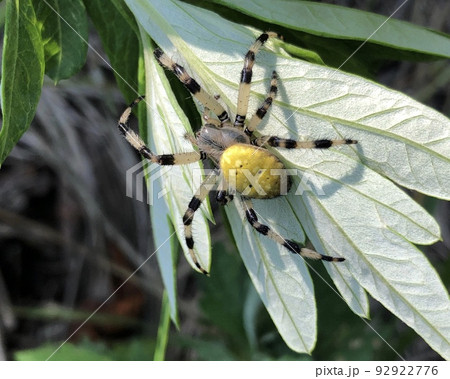 生き物 蜘蛛 ハナグモ、園芸家の味方です。ツツジの害虫として有名なルリチュウレンジを退治中です。
