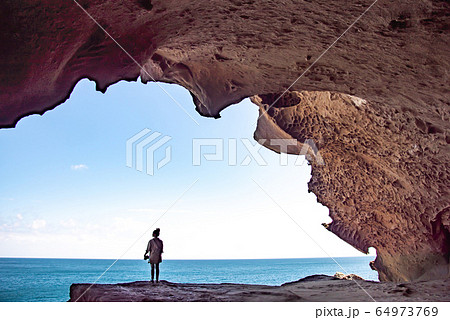 三重県 熊野市 鬼ヶ城 海を眺める女性