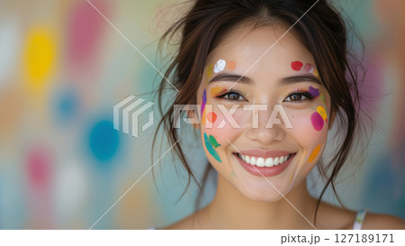 顔にカラフルなペイントをした笑顔の女性のポートレート