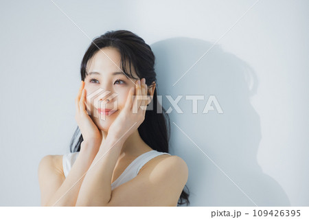 両手を頭に添えて正面を見つめるくびれの細い女性