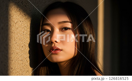 Young Asian Woman with Long Black Hair Posing in Studio with Dark Background