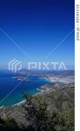 三豊市荘内半島の紫雲出山から眺める荘内半島西側と七宝山、燧灘、伊予の山々