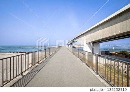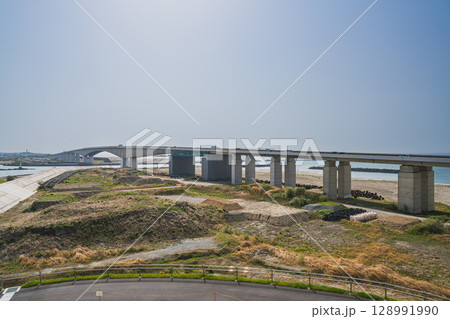 浜松市、今切口の砂浜と浜名大橋