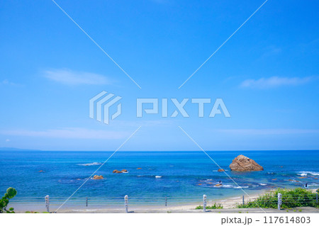 快晴の青空と青い海と奇岩が立ち並ぶ砂浜