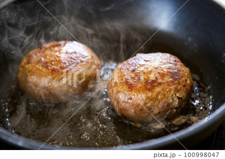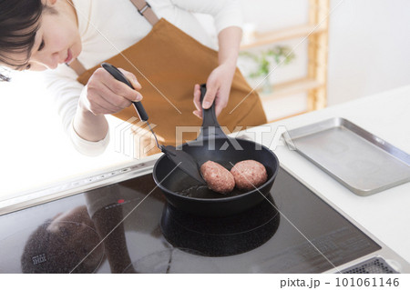 ハンバーグを焼く女性