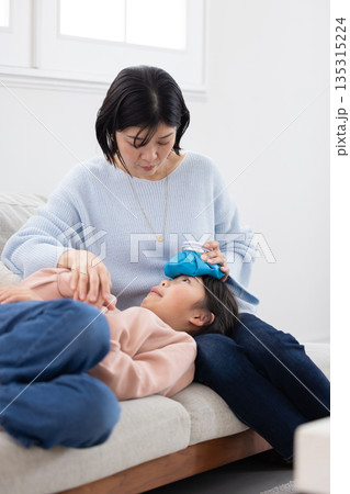 膝の上に寝かせた娘の額に手を当てて熱を計る母親