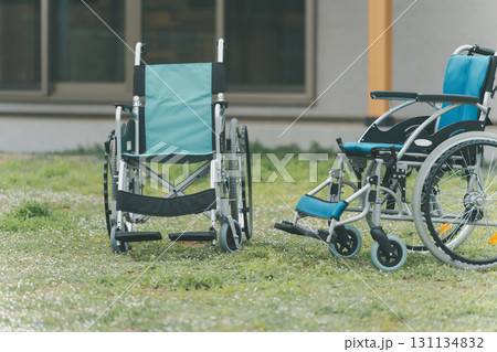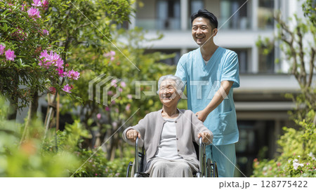 シニア男性が乗った車椅子を押して散歩する介護士 顔無し