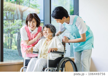 車椅子のシニアと若い介護士 撮影協力「LINK FOREST」