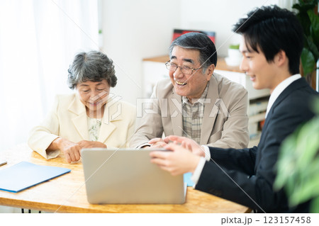 リフォーム相談をするシニア夫婦 シニア夫婦に営業するビジネスマン