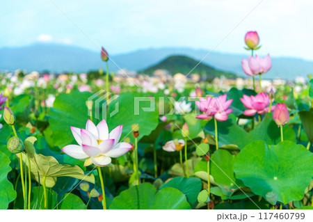 藤原京跡の蓮池に咲く蓮の花と奥に聳える畝傍山の景色