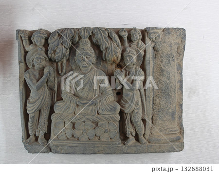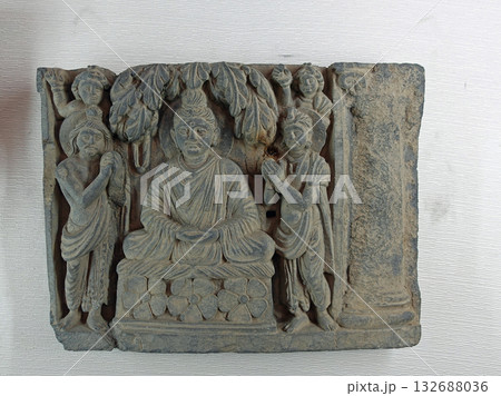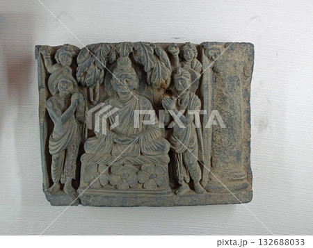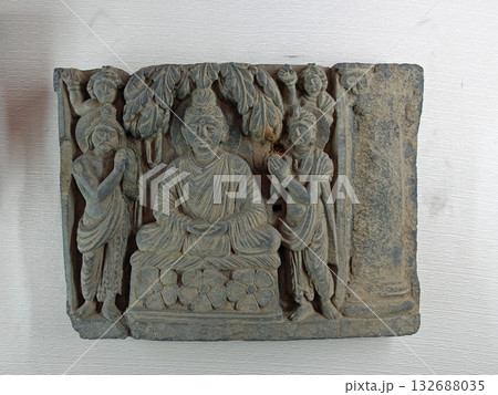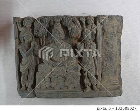 ガンダーラ美術にある仏教彫刻のひとつで人々から礼賛合掌される仏陀の姿を表したレリーフ