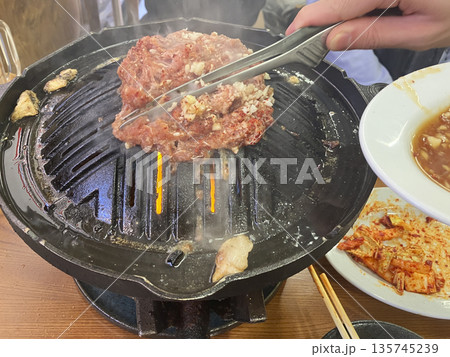 ジンギスカン、ラム肉を焼く