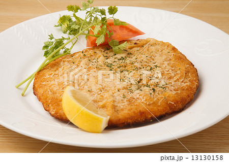 Wiener pork schnitzel steak, breaded meat with french fry on a plate. brown background. top view