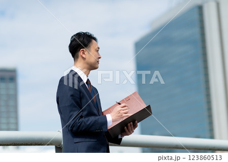屋外でバインダーを持つビジネスマン