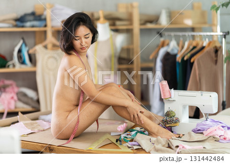 Woman plus size fashion designer uses a sewing machine in her studio.