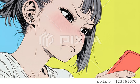 スマホでメールを読みながら唇を噛んでいる神経質な女性。表情には怒りと不安が漂っている。
