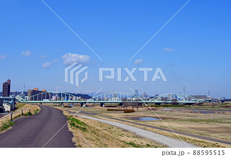 杜の都仙台 早春 広瀬川右岸の土手道から上流の大導水道橋と仙台市街地を眺望する