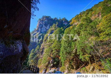 秋の山梨県甲府市の昇仙峡の昇仙橋付近から遊歩道と南側の巨岩を見る