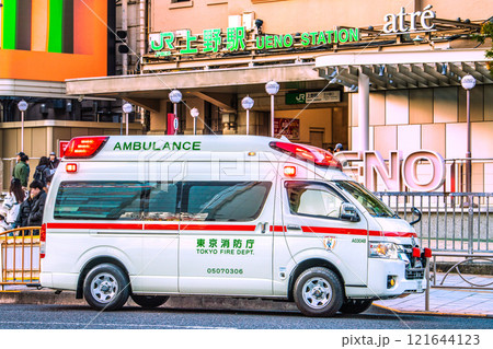 日本の東京都市景観 渋谷駅前に緊急出動した救急車=渋谷駅前・渋谷スクランブル交差点