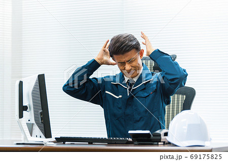 監督者のブロックと作業着を着たミドル男性ビジネスマン
