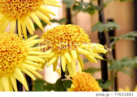 調布市の植物園に咲く大輪の黄色いキク(だるま作り)