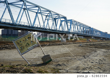 多摩川に架かる鉄橋と濁流で壊された看板 令和元年台風19号による被害