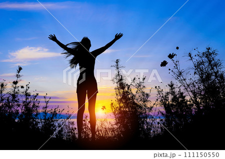 早朝の空を仰ぐ女性