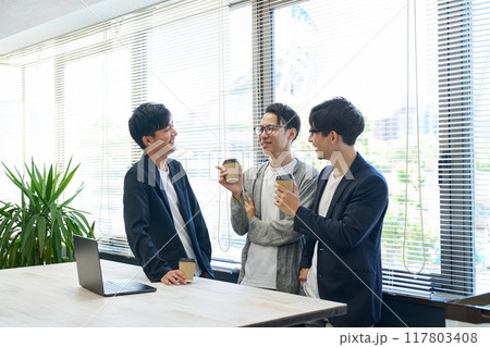 携帯画面を見ながら話すカジュアル姿のビジネスチーム