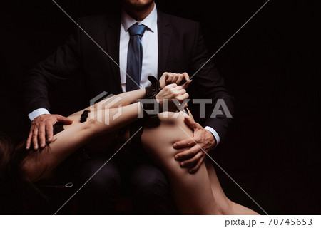male dominant squeezes the sexy ass of a submissive girl in handcuffs