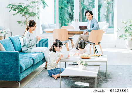 リビングでくつろぐ若い家族