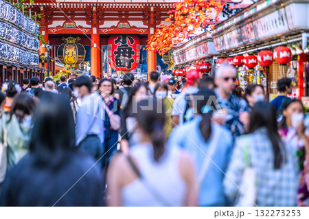 日本の東京都市景観 4月。脱コロナ…インバウンド完全復活、外国人観光客で賑わう浅草寺…=6日
