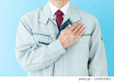 胸に手を当てる作業着姿のミドル男性ビジネスマン