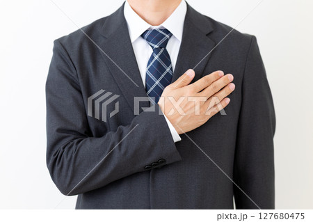 胸に手を当てるスーツを着たミドル男性ビジネスマン