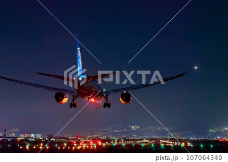 大阪空港(伊丹空港)の夜景 離陸中の飛行機 大阪府豊中市