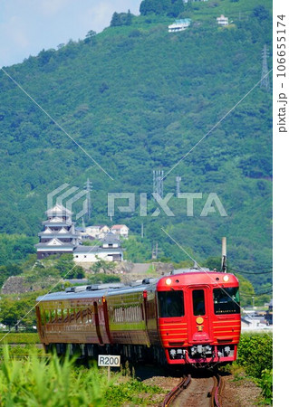 大洲城を背景に松山へと向かう観光列車「伊予灘ものがたり」