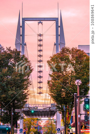 日本の横浜都市景観 夕焼けと電飾。関内駅すぐのイセザキ・モール(伊勢佐木町商店街)など望む=11月