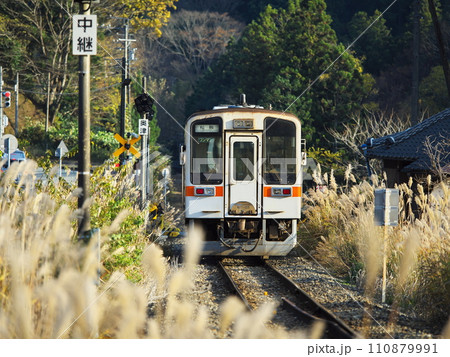 伊勢奥津駅付近のススキの中を走る気動車キハ11型