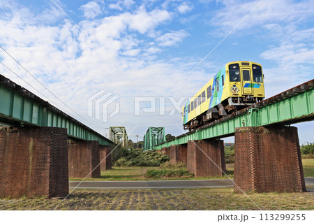 福岡県鞍手郡の遠賀川に架かる平成筑豊嘉麻川橋梁と車両