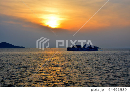 伊勢志摩、伊勢湾フェリーから眺める、すれ違うカーフェリーと、静かに沈んでいく夕日・鳥羽・三重県(3)