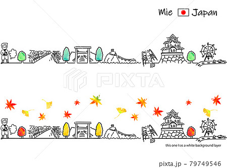 秋の三重県の街並みシンプル線画セット