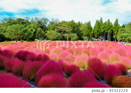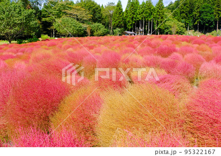 伊賀野の花畑 赤く色付くコキア 群馬県みなかみ町