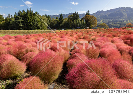 赤く色付くコキア 群馬県みなかみ町 伊賀野の花畑