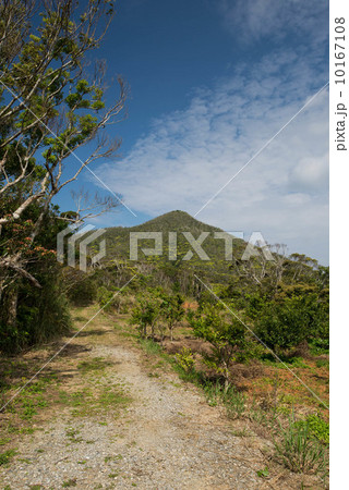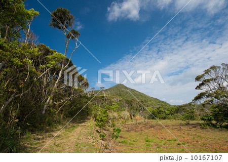 自然 風景 流れる雲と伊部岳、左に見える三角形は沖縄本島北部山原の山。標高は三百五十メートルほど