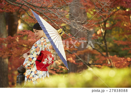鮮やかな紅葉と着物の女性 ポートレート