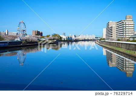 桜満開の隅田川とあらかわ遊園の新観覧車 鴨 カモメ