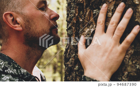 Adult man touches a huge tree, sniffs the bark and hugs the trunk. An adult man enjoys being alone with nature in the forest. The concept of nature conservation, forests, ecology. Human and nature.
