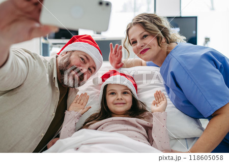 Nurse, father and daughter on hospital bed taking selfie. Sick little girl spending Christmas in hospital Nurse working shift on Christmas Eve.