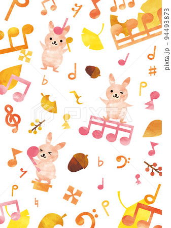 秋の水彩の音符と枯れ葉で遊ぶうさぎたちの背景 縦